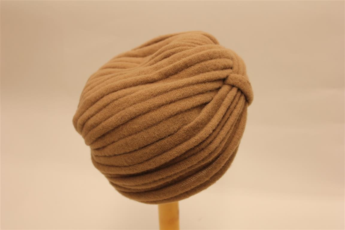 Einhver konar vafningur myndar húfuna. Gerfiefni, ljósbrúnt.