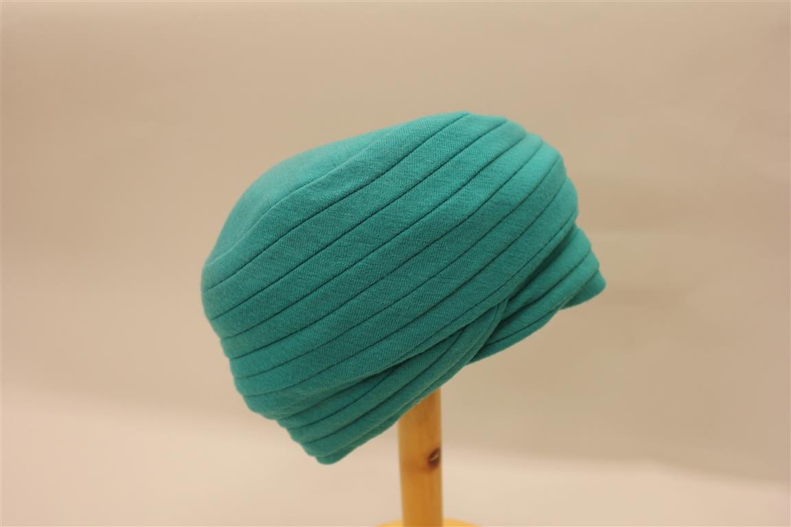 Kollhúfa úr gerfiefni. Sægræn, einhverskonar vafningur.