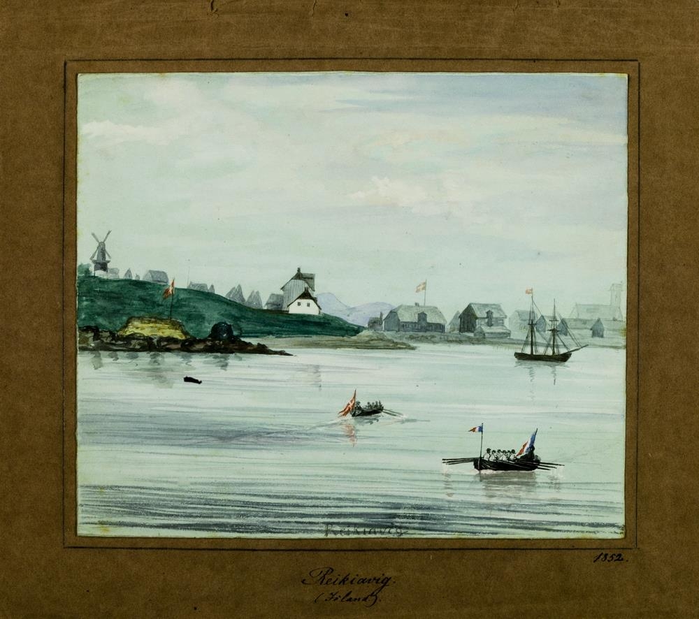 1852. Horft til bæjarins utan af höfn, 2 bátar og 1 skip í forgrunni.