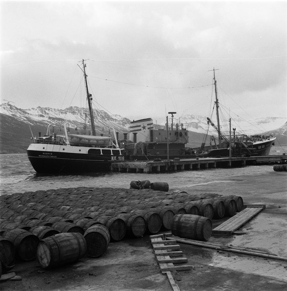 Skip við bryggju, tunnur liggja á kajanum.