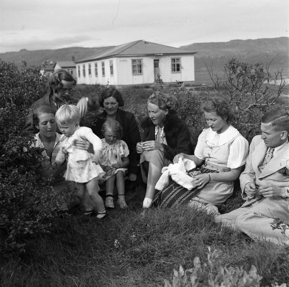 Fólk í kjarri með tvö börn. Guðrún Ólafsdóttir kona Björns M. Arnórssonar