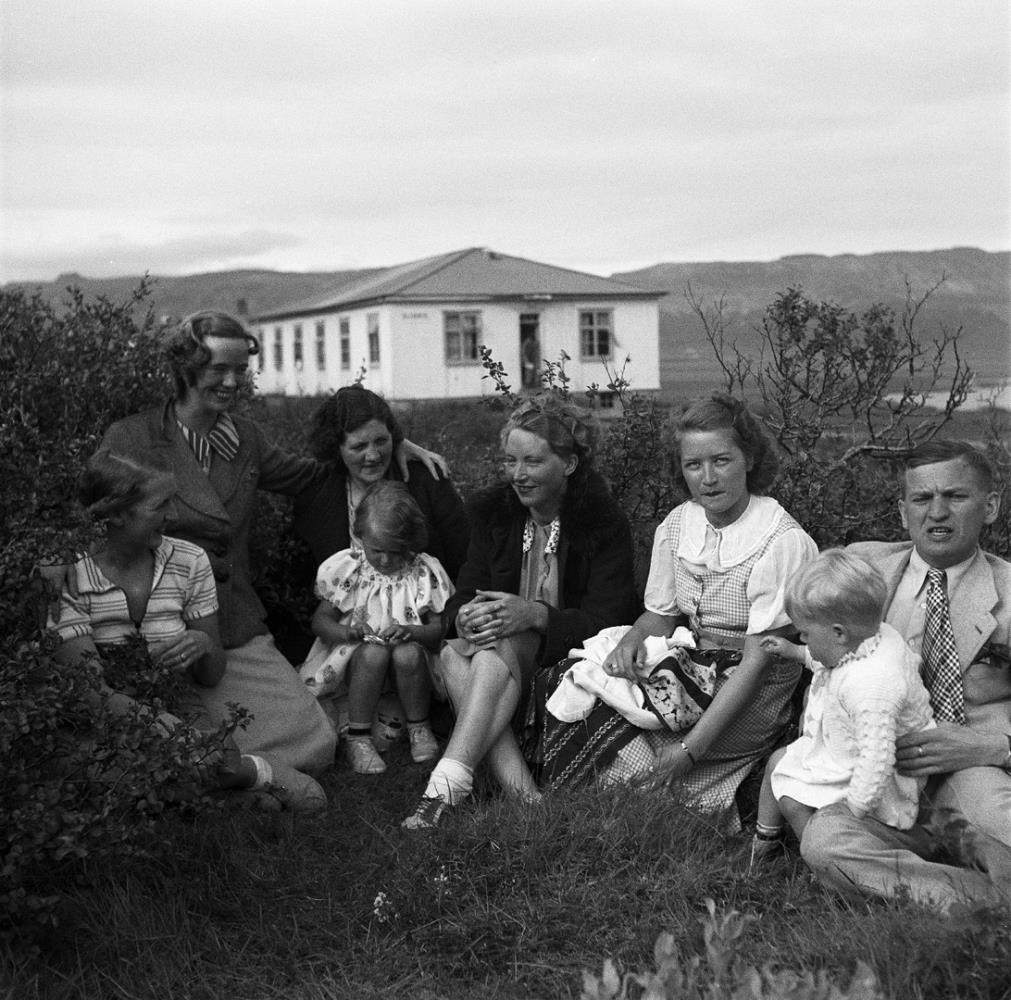 Fólk í kjarri með tvö börn. Guðrún Ólafsdóttir kona Björns M. Arnórssonar