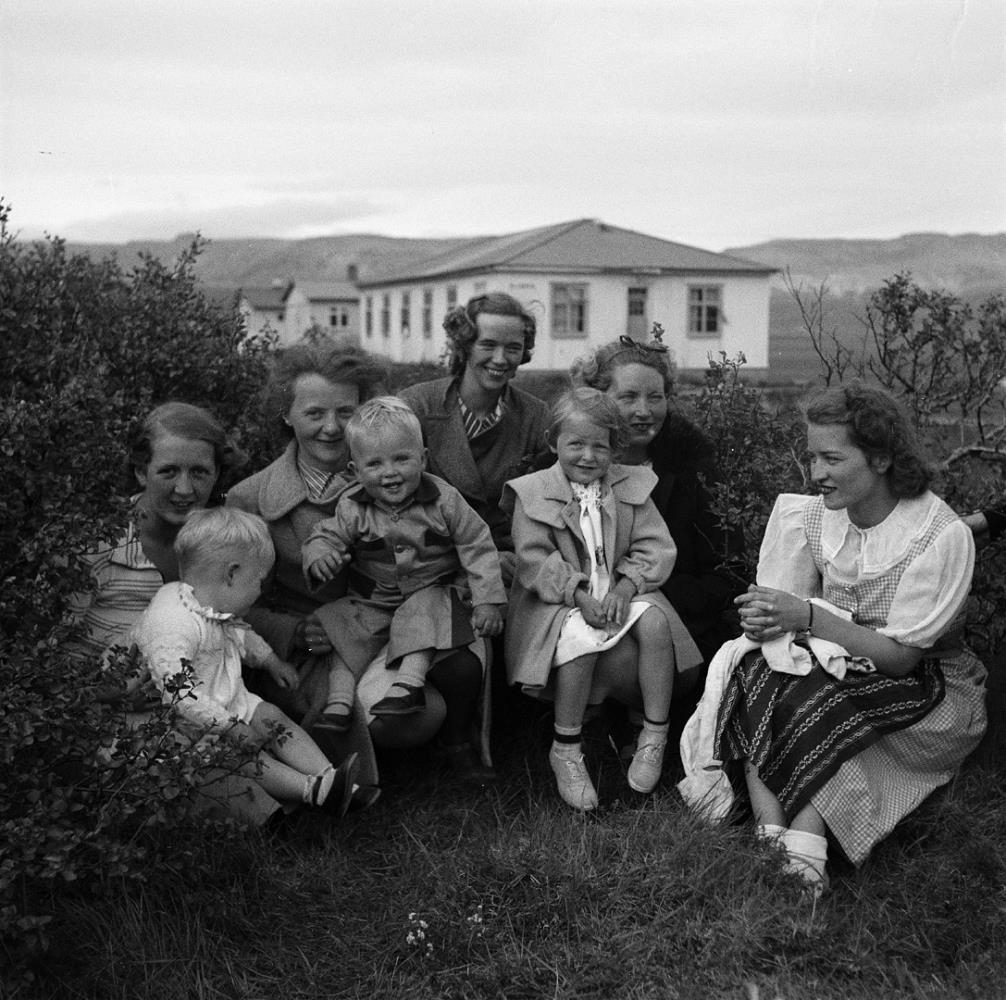 Fimm konur með þrjú börn í kjarri. Hús í baksýn. Katrín Ólafsdóttir Mixa