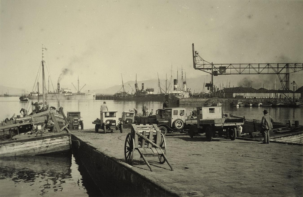 Í forgrunni er hallandi bryggja, allbreið, og eru á henni einir 5-6 Ford T vörubílar og hestakerra fremst. T.v. liggur e.k. prammi við bryggjuna og fiskibátur framan við hann. T.h. er verið að stækka bryggjuna. Í baksýn t.h. sést kolakraninn, reisur 1927, og stór kolabingur undir honum, og liggur flutningaskip við enda þeirrar bryggju. Fjær í miðju og t.v. eru nokkur kaupskip.