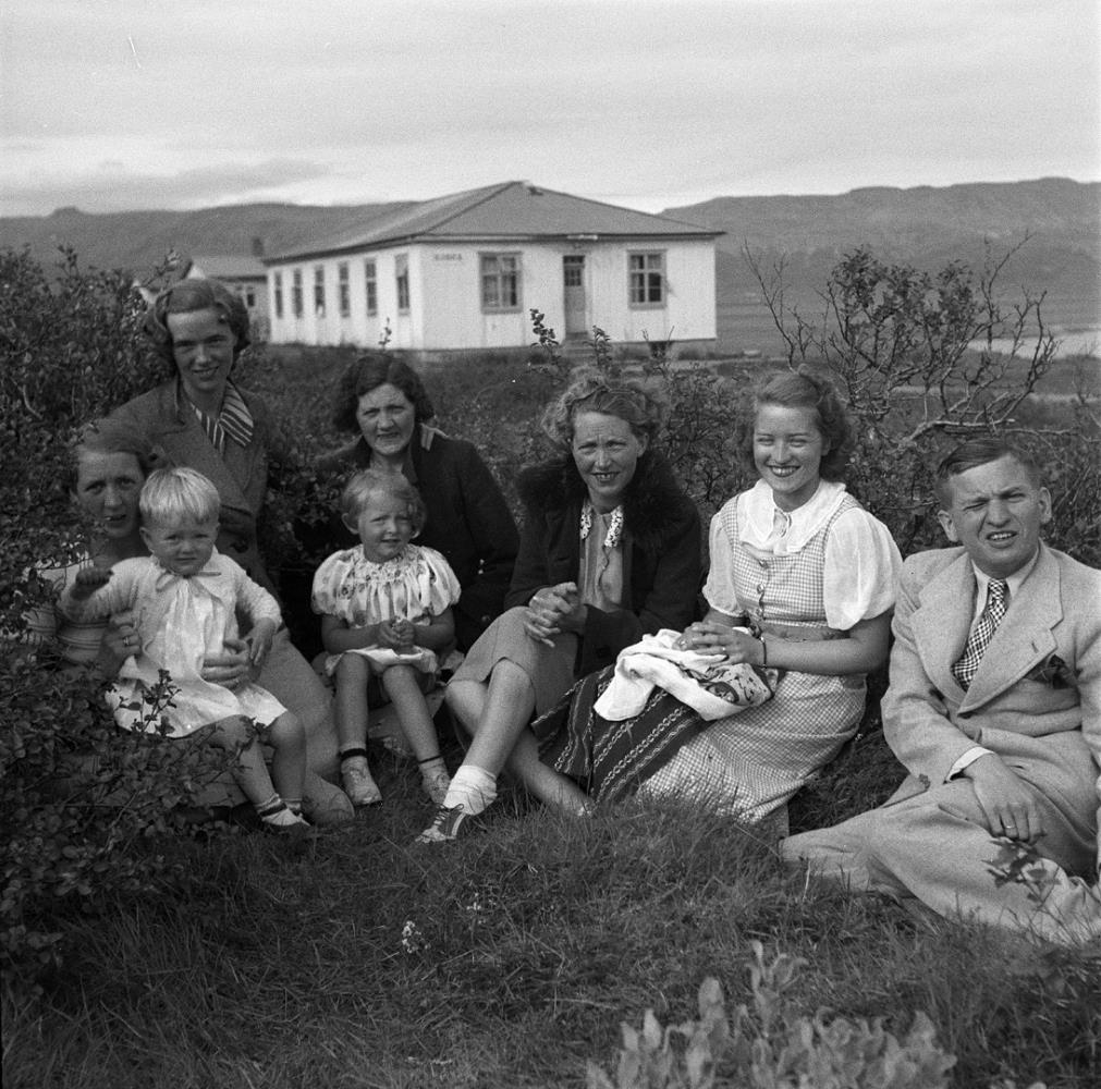 Fólk situr í kjarri með tvö börn. Hér má þekkja Guðrúnu Runólfsínu Jónsdóttur