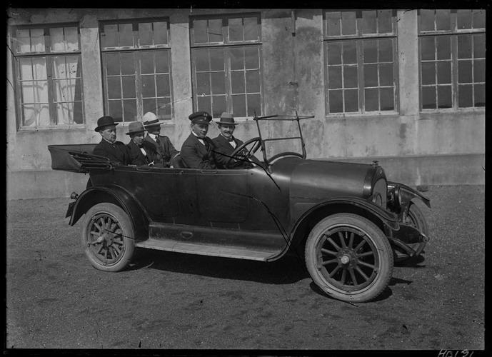 Overland bíll Sigurðar Óla Ólafssonar við barnaskólann á Eyrarbakka. Farþegar: Nils Ísaksson verslunarþjónn, Einar Kristjánsson lyfjasveinn, Guðmundur Guðmundsson kaupfélagsstjóri, Sigurður Óli Ólafsson, Stað og Andrés Jónsson kaupm.