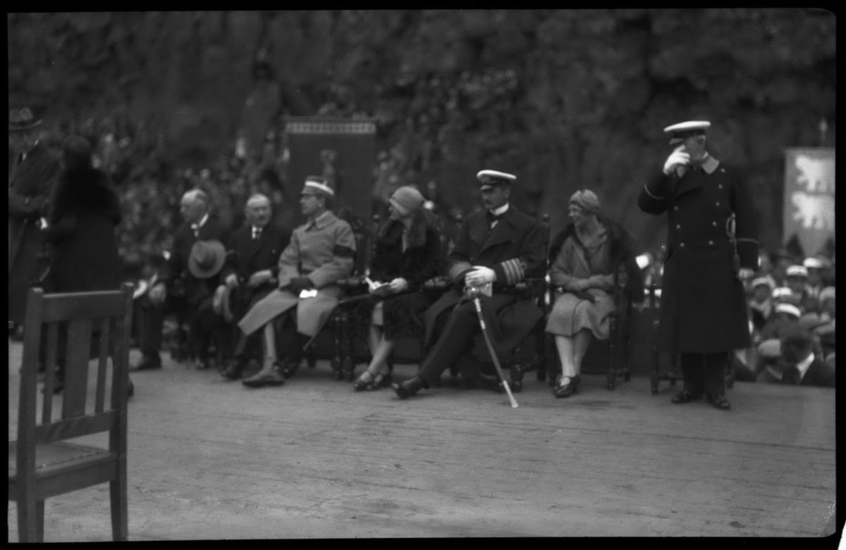 Fólk (7) sitjandi á trépalli. Konunglegir gestir á Alþingishátíðinni. Frá vinstri: Matthías Þórðarson þjóðminjavörður, Magnús Sigurðsson bankastjóri, Gústaf VI Adolf þá Svíaprins, Alexandrína drottning Danmerkur, Kristján X. konungur Danmerkur, frk. Schested hirðmær, Jón Sveinbjörnsson konungsritari.