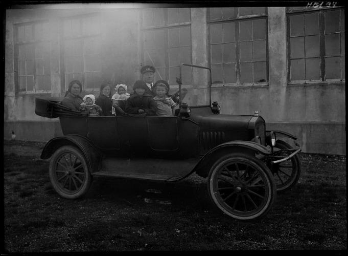 Steingrímur Gunnarsson bílstjóri á Strönd í bíl sínum. Farþegar: T.f.v. Þuríður Guðjónsdóttir frá Hólmsbæ kona Steingríms með Jórunni dóttur þeirra, Ragnheiður Oddsdóttir kona Ásgríms Guðjónssonar frá Hólmsbæ, mágkona Þuríðar, með dóttur sína Ragnheiði, Kirstín Blöndal og Guðjón Steingrímsson.