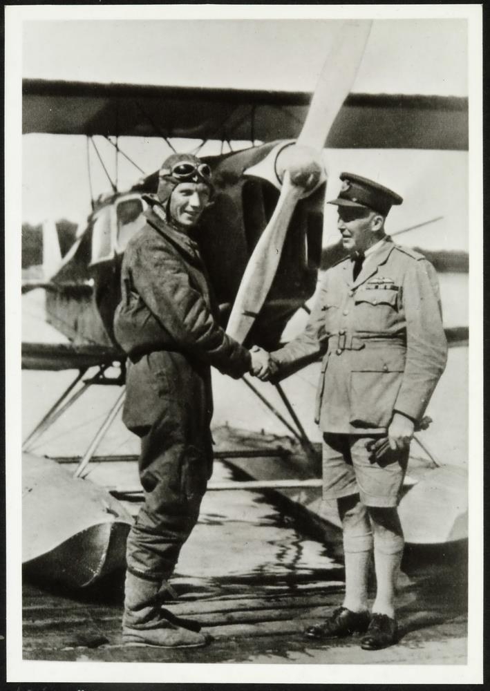 Eftirtaka. Myndin sýnir flugmann og herforingja takast í hendur fyrir framan litla sjóflugvél, einshreyfils tvíþekju af gerðinni DH Gipsy Moth ROUGE et NOIR. Úr syrpu af myndum teknum í tengslum við ferðir John Grierson til Ameríku og Light frá Ameríku á árunum 1933 og 1934. Í tengslum við myndina er skrifað á síðuna: 'Í Kanada'. Í meðf. skrá stendur: 'Yfirm. Kanad.Flughersins fagnar Grierson, Ottawa, Kanada. 30.8.1934.'.