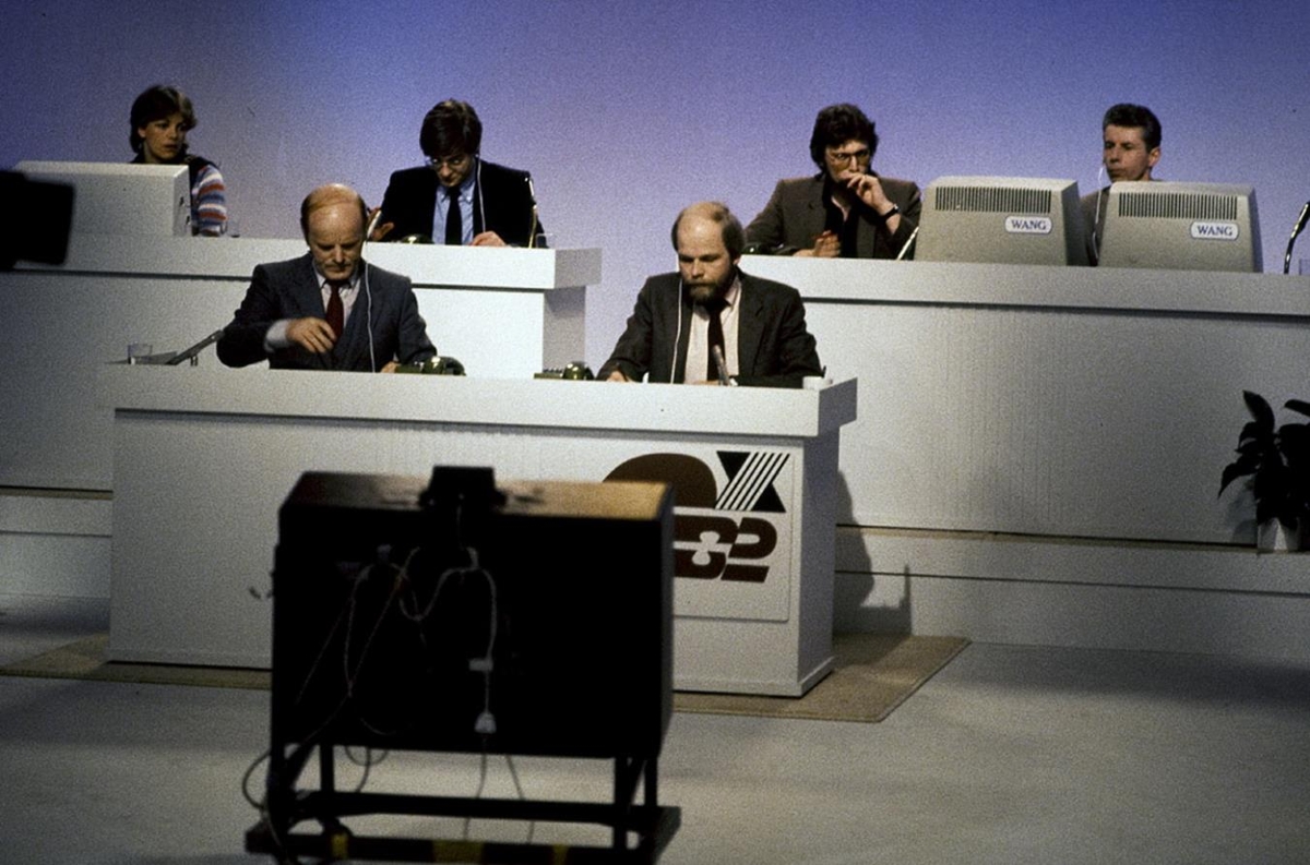 Kosningasjónvarp - alvíð mynd úr stúdíói - stjórnendur kosningasjónvarpsins og aðstoðarfólk. Ljósm: ? maí '82.