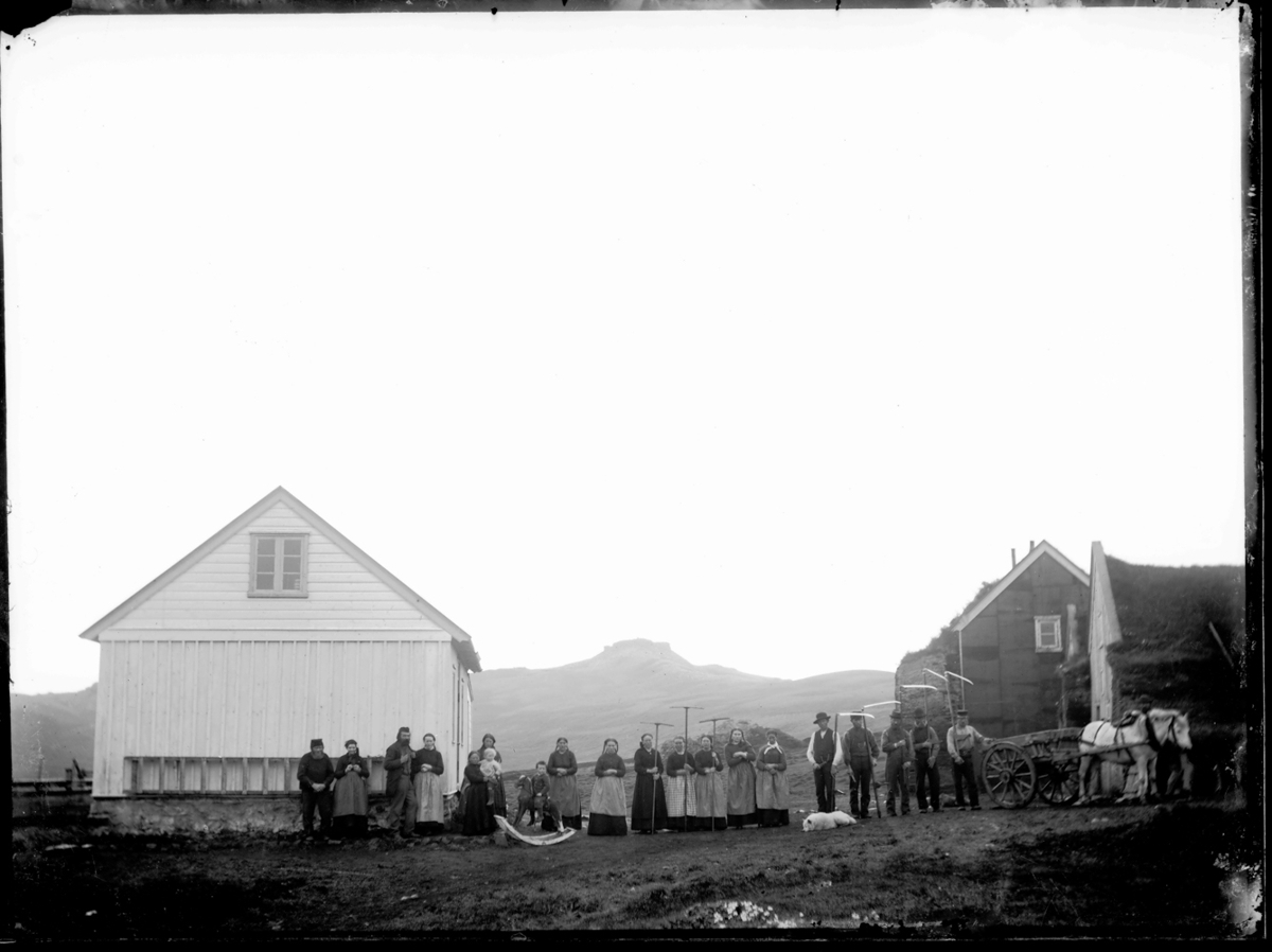 Bær og heimilisfólk á Stóru Borg í Víðidal um 1895. Timburhús annars vegar á hlaðinu en torfbær hins vegar. Vinnufólkið heldur á amboðum, konur á hrífum og karlar á orfum með ljá. Hestur með hestakerru. Rugguhestur. Fólkið á myndinni er t. f. v. Kristófer Finnbogason, Stóra-Fjalli og kona hans Helga Pétursdóttir, Pétur Kristófersson húsbóndi og Elísabet Guðmundsdóttir húsmóðir, Arndís Kristófersdóttir með Kristófer Pétursson í fanginu, óþekkt kona að baki þeim, Vilhjálmur Pétursson á rugguhesti, óþekkt, óþekkt, Sigríður Bessadóttir óþekkt, óþekkt, óþekkt, óþekkt, óþekktur, óþekktur, óþekktur, óþekktur, Gunnlaugur Búi Skarphéðinsson.