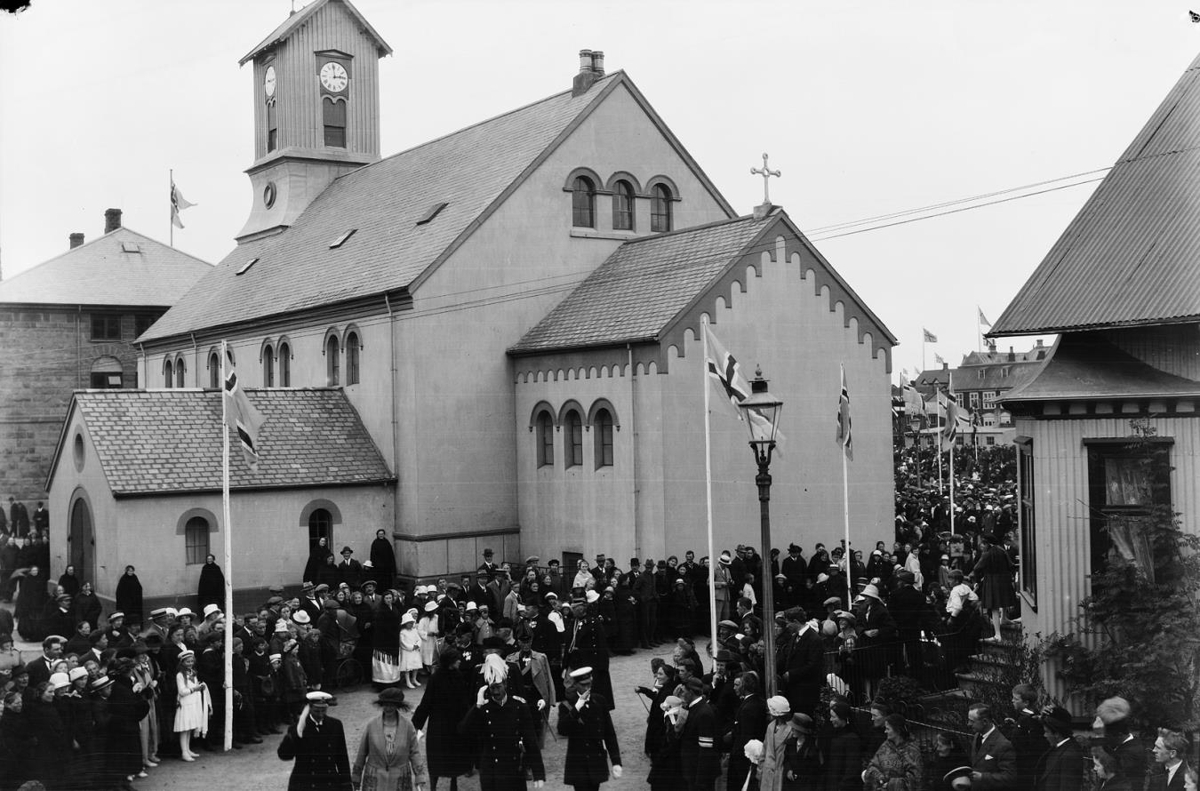 handan við kirkju. Götuljós. Íslenskir fánar. Fremst fara Kristján X konungur,