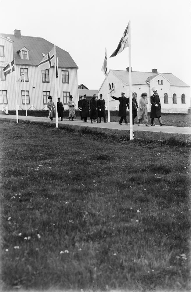 fólks á gangi niður steyptan stíg frá timburhúsi. Íslenski og danski fáninn