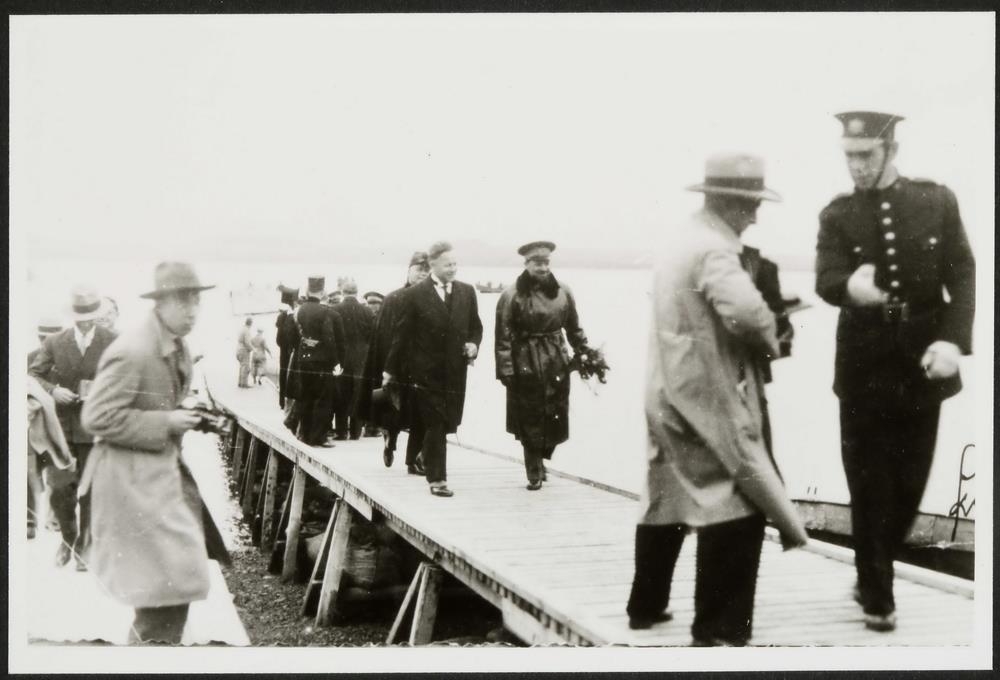 Eftirtaka. Myndin er af landgöngu ítalska flugforingjans Balbo í Vatnagörðum 5. júli 1933. Í forgrunni eru ljósmyndarar að störfum og upp hallandi trébryggju kemur hópur karla gangandi, einn er í herforingjabúnaði, kálfasíðri leðurkápu og einkennishúfu og með blómvönd í vinstri hendi. Við hlið hans gengur karlmaður í borgaralegum klæðum. Í baksýn eru bátar á sjónum. Úr syrpu af myndum teknum í tengslum við hópflug Ítalska flugforingjans Balbos til Ameríku sumarið 1933. Í tengslum við myndina er skrifað á síðuna: „í Vatnagörðum 5. júlí 1933“.