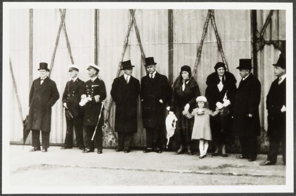 Eftirtaka. Myndin sýnir röð fyrirfólks sem bíður landgöngu Balbos flugsveitarforingja við vegg flugskýlis í Vatnagörðum. Úr syrpu af myndum teknum í tengslum við hópflug Ítalska flugforingjans Balbos til Ameríku sumarið 1933. Í tengslum við myndina er skrifað á síðuna: „í Vatnagörðum 5. júlí 1933“.