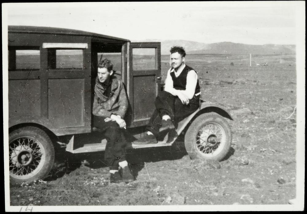 Eftirtaka. Myndin sýnir tvo karlmenn, annar situr í farþegadyrum á gömlum Ford T, hinn situr á hægra aurbretti að framan. Báðir fylgjast með einhverju sem gerist t.v. aftan við ljósm. Úr syrpu af myndum teknum í tengslum við starfsemi íslenskra svifflugáhugamanna á Sandskeiði. Í tengslum við myndirnar er skrifað á síðuna: 'Svifflugfélag Íslands' og 'Sandskeiði 1938'. Í meðf. skrá stendur: „Björn Eiríks./Árni Haraldss. Sandskeiði 1938. Ljósm. Sig. Jónsson.“
