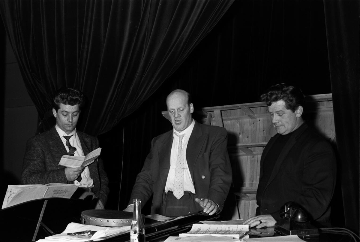 „Þetta eru frá vinstri Jón Gunnlaugsson, Hjálmar Kjartansson og Birgir Halldórsson, leikarar og söngvara á æfingu í þýskum söngleik í Framsóknahúsinu 1960. Reynir Oddsson var stjórnandi. Söngleikur þessi komst aldre á svið vegna fjárhagsvandræða o.fl.“ (RO 2021)