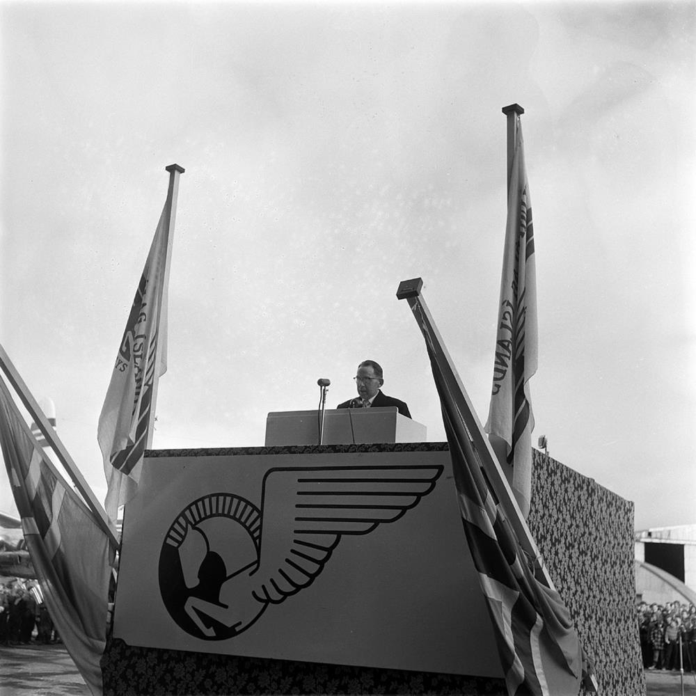 Viscount kemur til Reykjavíkur. Karlmaður stendur við ræðupúlt og flytur ræðu.