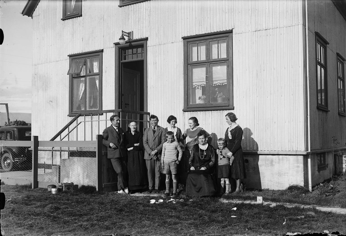 fólks stendur við húsvegg. Þekkja má Björn M. og Ólaf Ingimar Arnórssyni