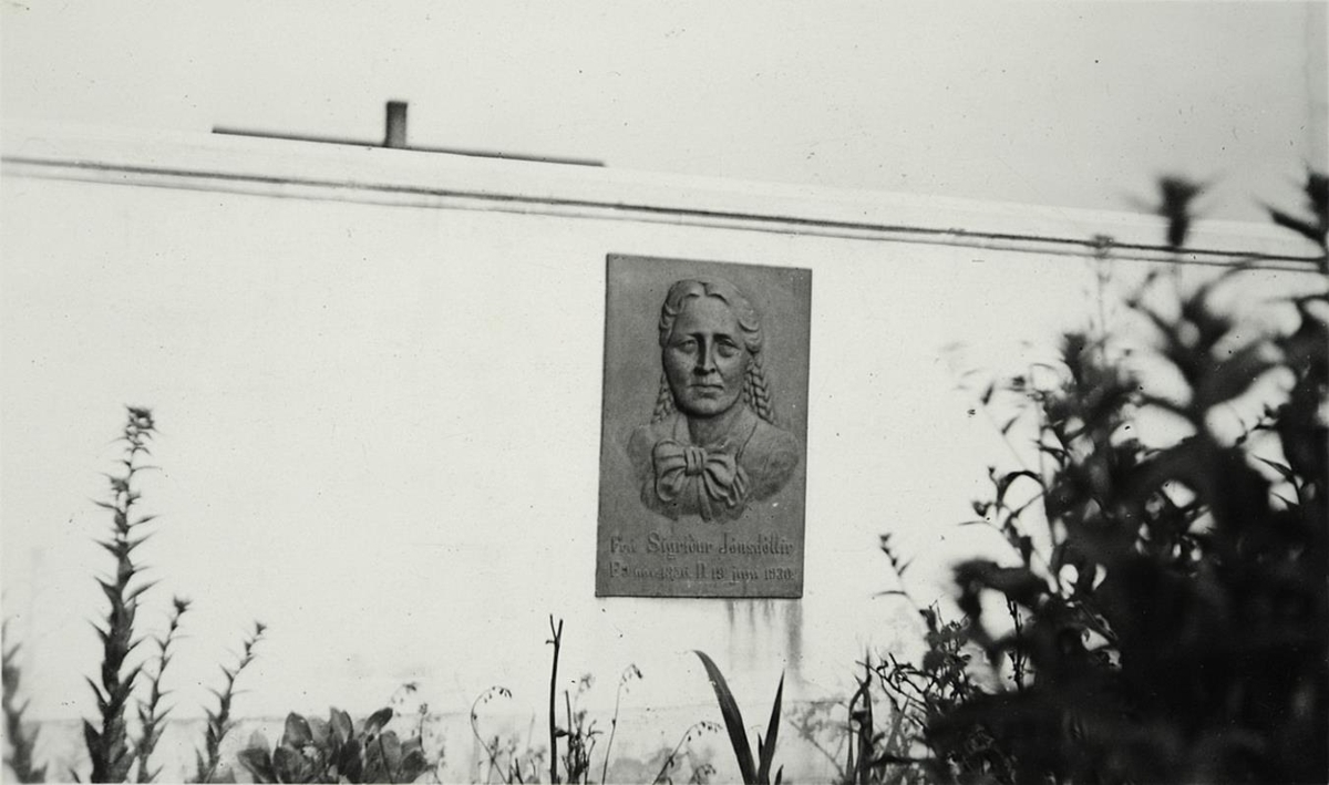 vegg er lágmynd af konu með þykka fléttu í hárinu. Undir myndinni má lesa