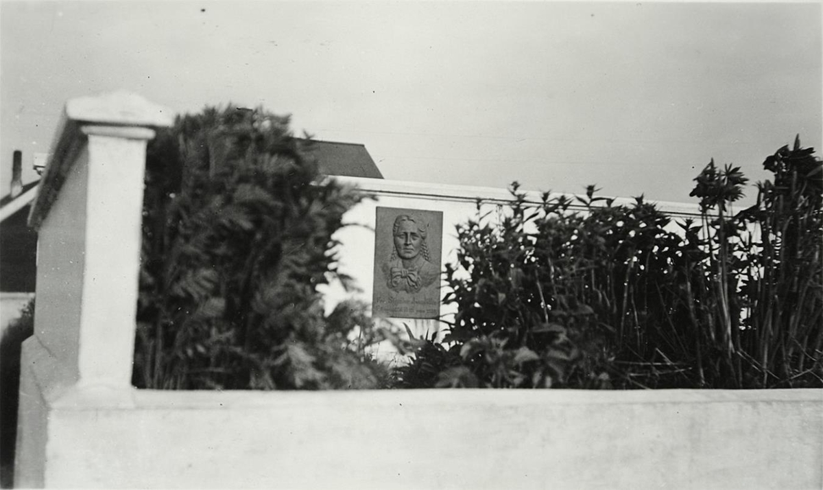 vegg er lágmynd af konu með þykka fléttu í hárinu. Undir myndinni má lesa