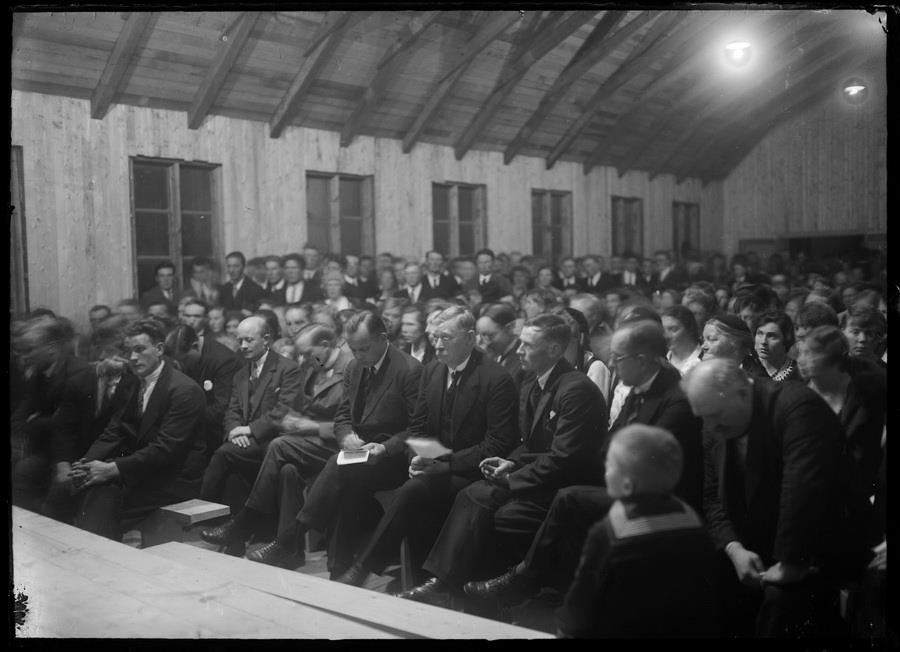 Samkoma í íþróttasal. Mannfjöldi situr og stendur. Líklega fyrsta setning