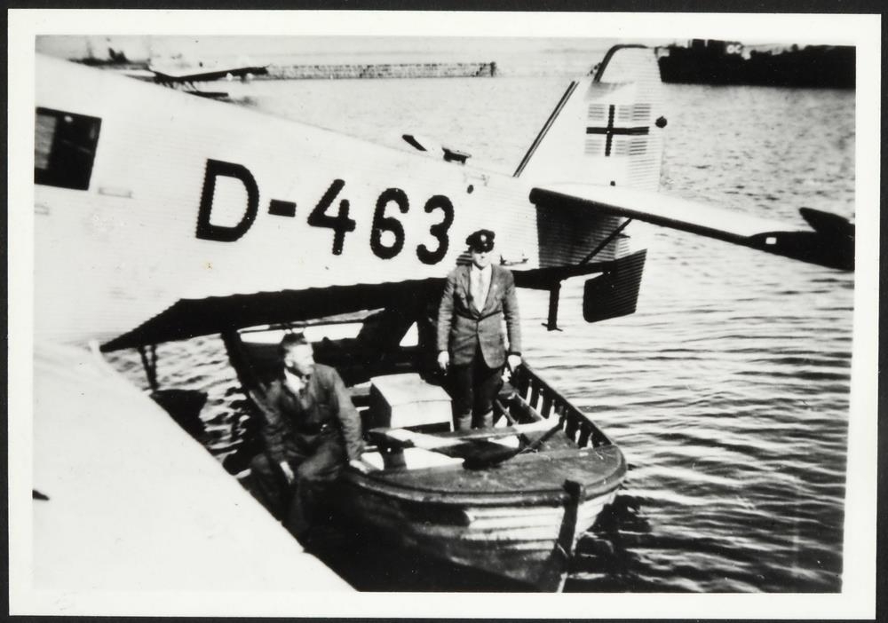 Eftirtaka. Í forgrunni er hluti vængs, afturhluti og stél sjóflugvélar með einkennisstafina D-463 og íslenska fánann á stélinu. Við afturhlutann er árabátur og í honum tveir karlmenn, annar þeirra með einkennishúfu. Í baksýn er hafnargarðurinn og innsiglingin í Reykjavíkurhöfn og yst t.v. má grilla í aðra sjóflugvél. Úr syrpu af myndum af starfsemi Flugfélags Íslands á fyrstu starfsárum þess 1928-1931. Í tengslum við myndina er skrifað á síðuna, í einföldum ramma: 'Flugfélag Íslands 1928-1931' og á öðrum stað í tvöföldum ramma: 'FYRSTA reglulega farþegaflug á Íslandi - 4. júní 1928...'. Neðst á síðunni er skrifað: 'I-1 Súlan'. Undir myndinni er skrifað: 'Reykjavík'. Í meðf. skrá stendur: Í-1 Súlan í Rvíkurhöfn - Bj. Olsen, H. Christiansen'.