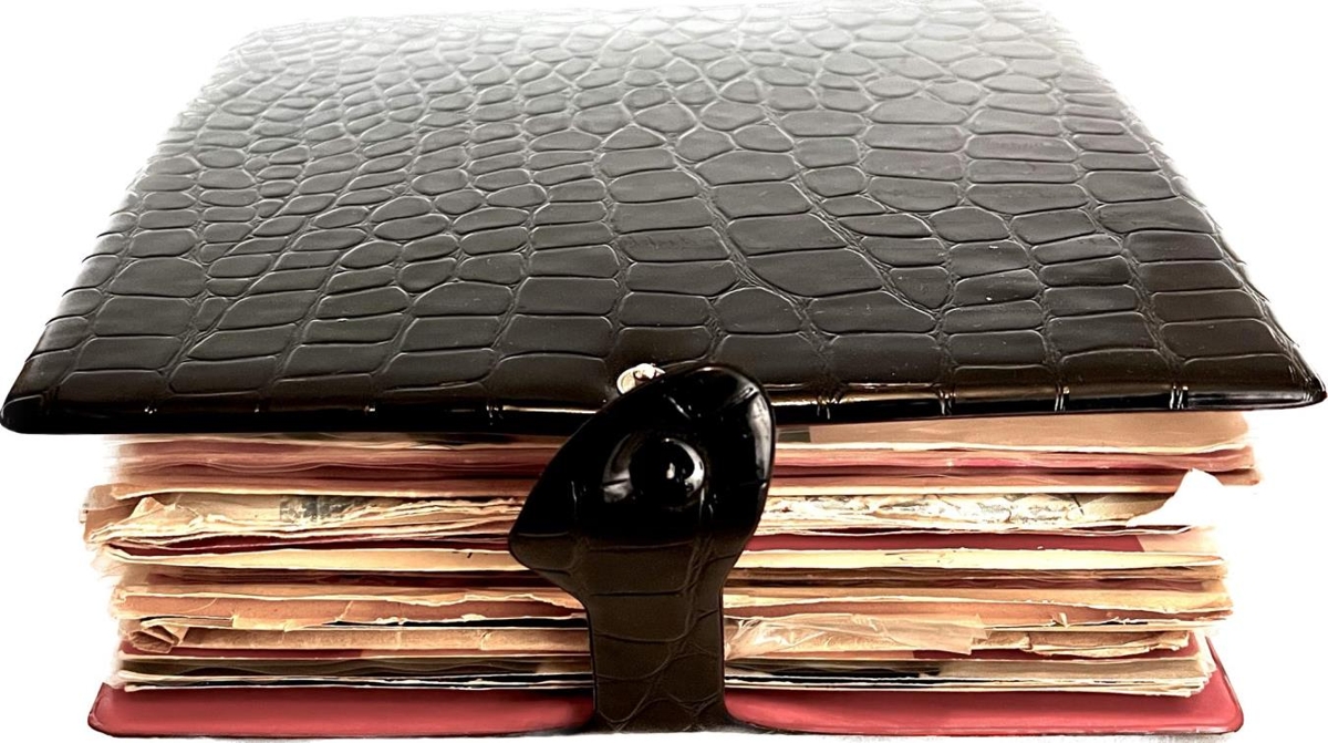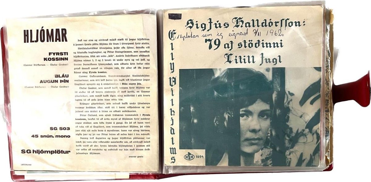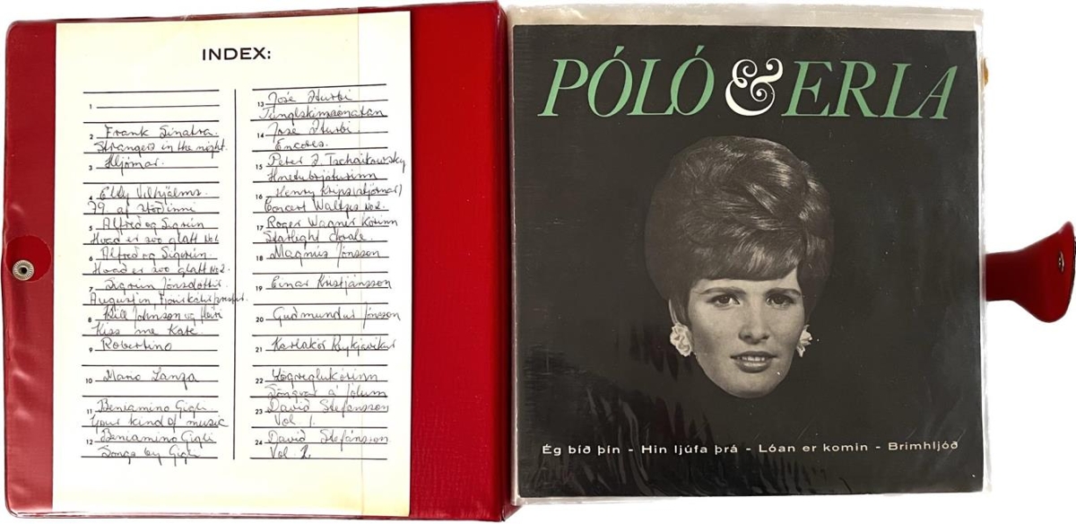 Svart og rautt plötualbúm úr plasti með litlum plötum, Íslenkar og erlendar plötur.