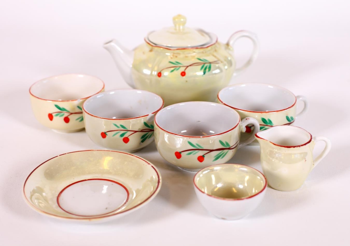Fallegt ljóst lítið bollastell úr eigu Bryndísar. 4 bollar 7,5-6-3,5cm, kanna 5-3,5-3,5cm, skál 4-4-2cm, diskur 8,5-8,5-2cm, ketill 13,5-10-8cm.