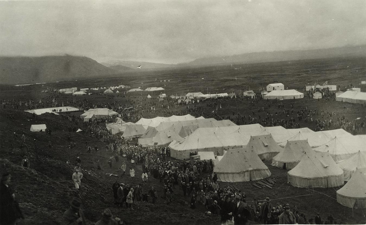 samkomutjöld, eftir miðri mynd og til hægri. Fyrir aftan má sjá fleiri