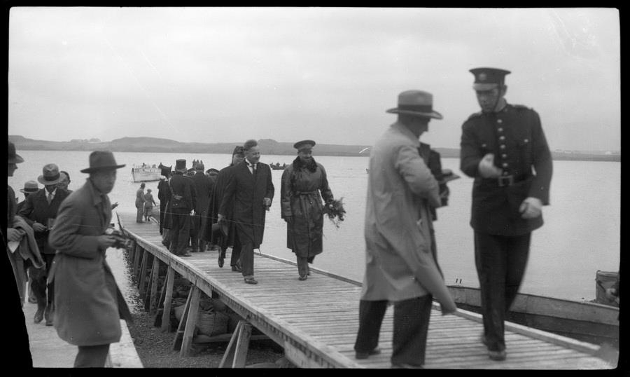 upp trébryggju. Lögreglumaður og ljósmyndari fremst. Maður í leðurfrakka