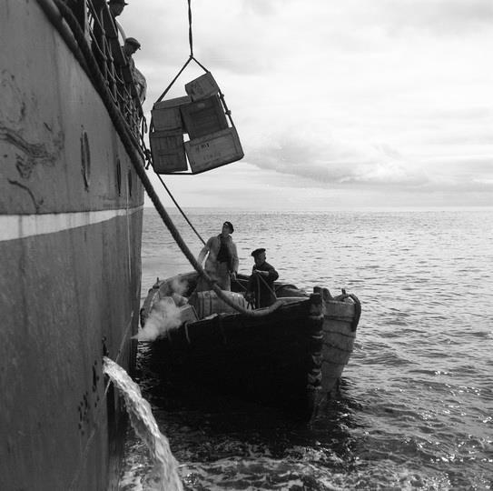 menn í bátnum. Verið er að hífa varning upp í skipið eða niður í bátinn.