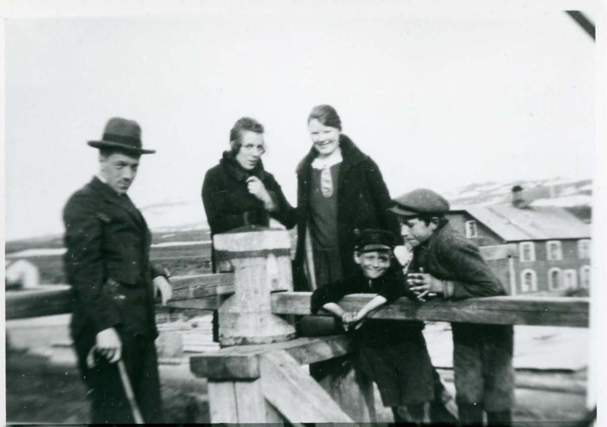 Til vinstri er karlmaður með hatt, þar næst tvær konur og svo tveir drengir. Þau standa við bátsspil. Í baksýn til hægri má sjá hús.