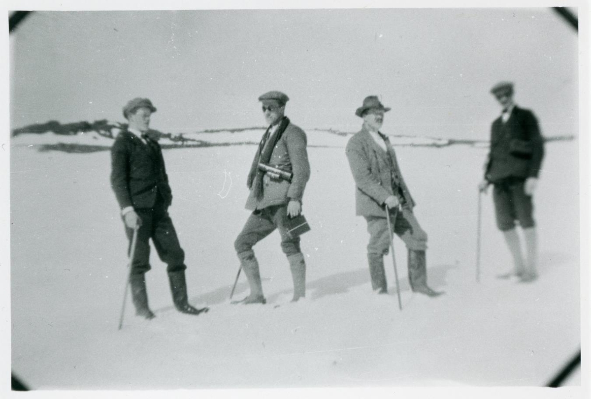 Fjórir karlmenn í göngufatnaði á ísi lögðu vatni eða sjó. F.v.: Pálmi Sigurðsson, Björn P. Blöndal, Sigurður Pálmason og Jóhannes Davíðsson. (uppl. Þór Magnússon)