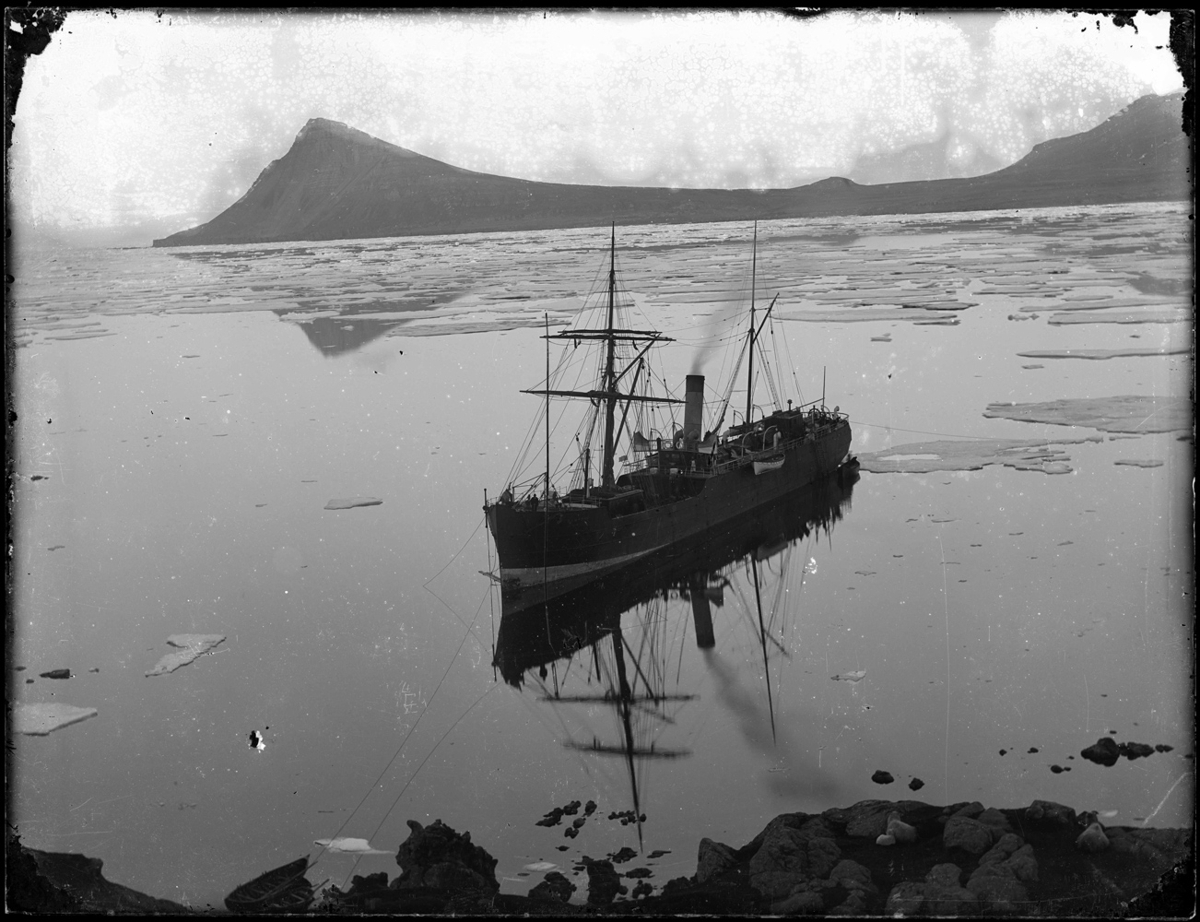 „Þessi mynd af vesturfaraskipinu Camoens við land í Norðurfirði (nálægt Krossnesi) í Árneshreppi á Ströndum er nærri örugglega tekin í júní 1883 þegar skipið þurfti að sigla þar að landi til viðgerða eftir að hafa laskast. Skipið lokaðist svo þarna inni í nokkrar vikur vegna hafíss. Á meðan biðu vesturfarar á Borðeyri fram í ágústbyrjun, sumir í tjöldum.“ (JJ 2017)