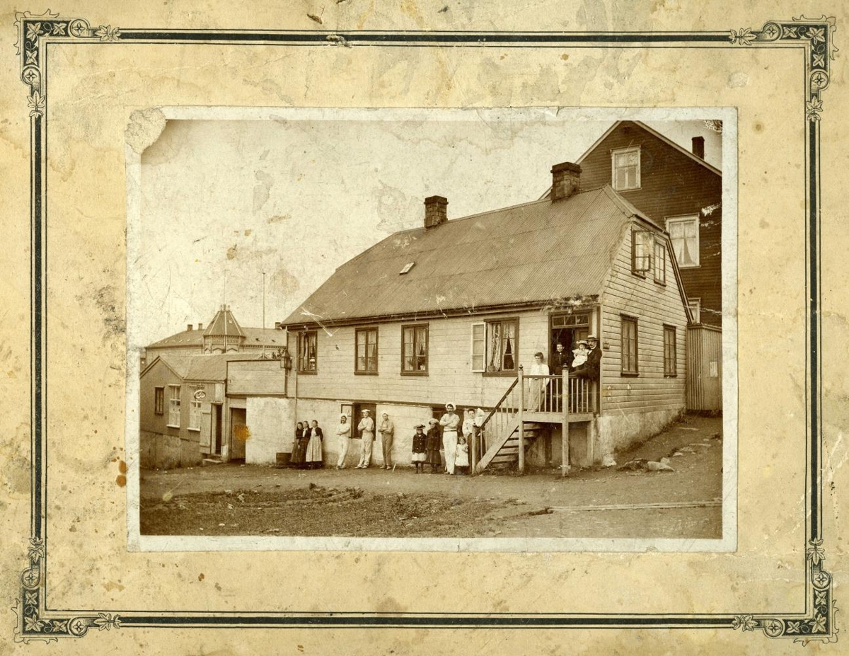 „Rétt nöfn eru þessi: Bakarinn með hvíta bakarahúfu og krosslagða arma er afi minn Edvard Frederiksen, 1879 - 1954. (Sjá Gottuleiðangurinn). Konan við hlið hans er amma mín, Guðrún Sigurlaug Þorgrímsdóttir frá Nesi í Aðaldal, 1882 - 1927. Hún heldur á dreng, sem síðar varð faðir minn; Edward, 1904 - 1971. Á milli hjónanna stendur Jóhanna dóttir þeirra, 1901 - 1993. Í dyragættinni stendur Jóhanna Jónsdóttir Austmann, langamma mín, 1847 - 1910. Sitjandi á handriðinu er Hjörtur, 1884 - 1915, afabróðir minn. Hann heldur á Othelíu dóttur sinni. Eftir andlát Hjartar, en hann var ekkill, flutti (ráðs?-) kona hans, sem var dönsk, með tvær dætur Hjartar til Danmerkur. Þar urðu þær um kyrrt. Inger, systir þeirra bræðra, 1875 - ??, stendur á efsta þrepinu. Börn, bakarasveinar og stúlkur, sem einnig eru á myndinni, veit ég ekkert um.“ (EF 2022)