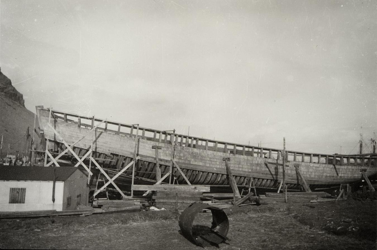 Allstór trébátur í smíðum í skipasmíðastöð og er búið að klæða hluta af byrðingnum. Framanvið t.v. er dálítill skúr með reykröri út um vegginn.