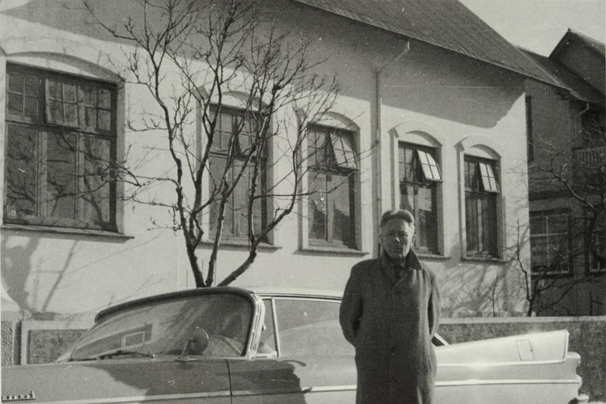 rithöfundur en fyrir aftan hann er bifreið og tvö hús, annað steinhús en