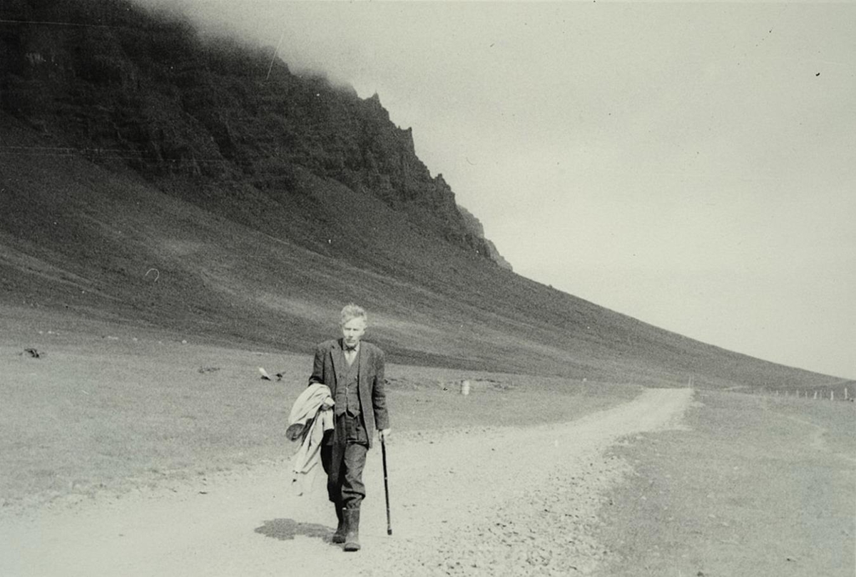 rithöfundur á gangi eftir malarvegi. Í baksýn til vinstri er fjall.