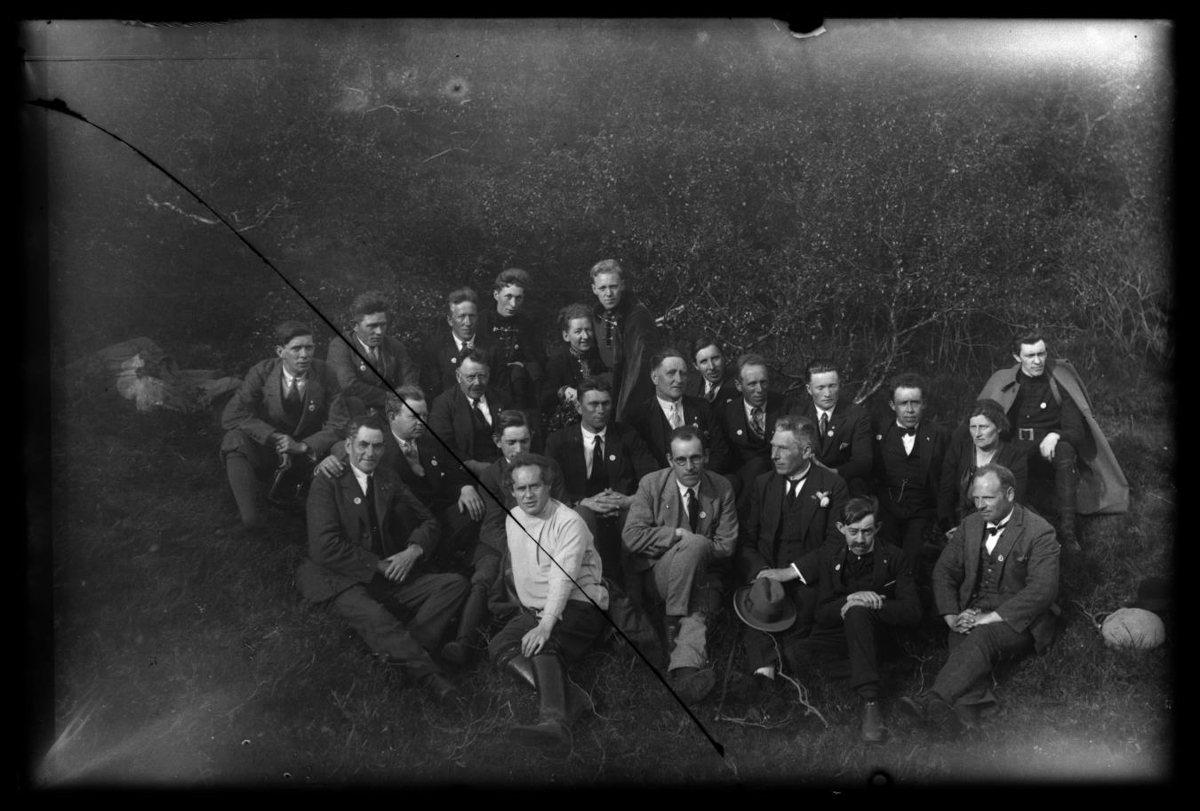 Hópur fólks við skóglendi, ungmennafélagar.