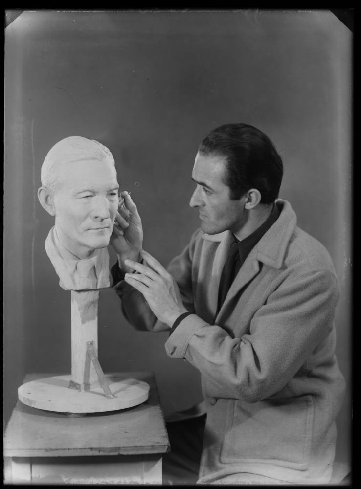 Maður að búa til vaxmynd af höfði karlmanns. Verið að gera eina af styttum í Vaxmyndasafninu.