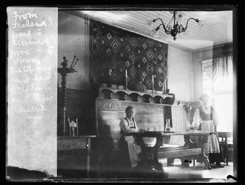 Noregur? Tvær konur í þjóðbúningnum í stofu þar sem er borð, skreyttur bekkur með hillu yfir sem á stendur bústa af manni, veggteppi þar fyrir ofan. Sér í ofn í horni. Prestur til að hengja á föt. Ljósakróna.