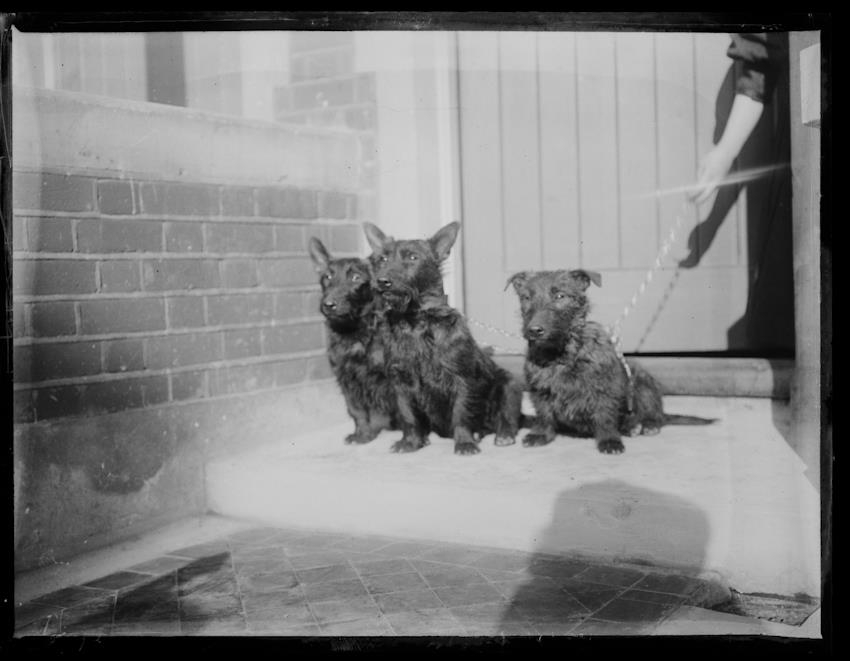 Litlir svartir hvolpar á stétt við húsdyr. Múrsteinsveggur. Líklega erlendis.