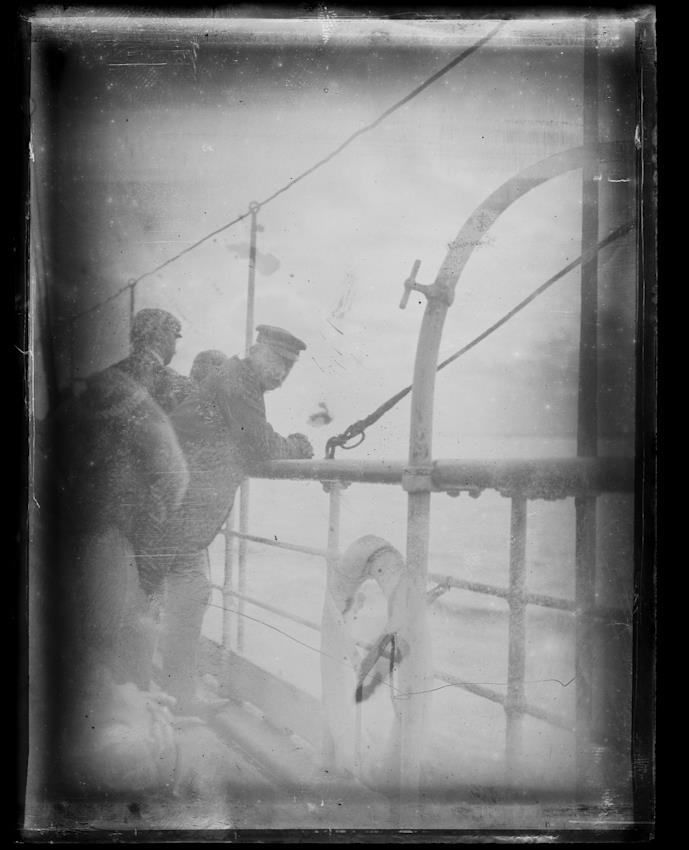 Karlar halla sér fram á borðstokkinn