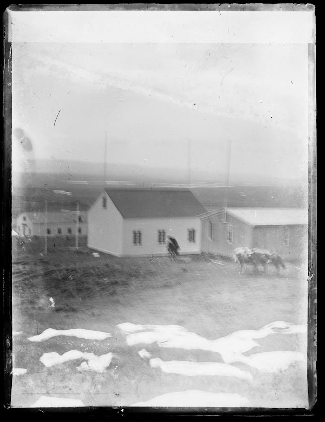 Þingvellir. Konungskoman 1907. Konungshúsið. Þingmannahúsið í baksýn. Þvottur til þerris í forgrunni.