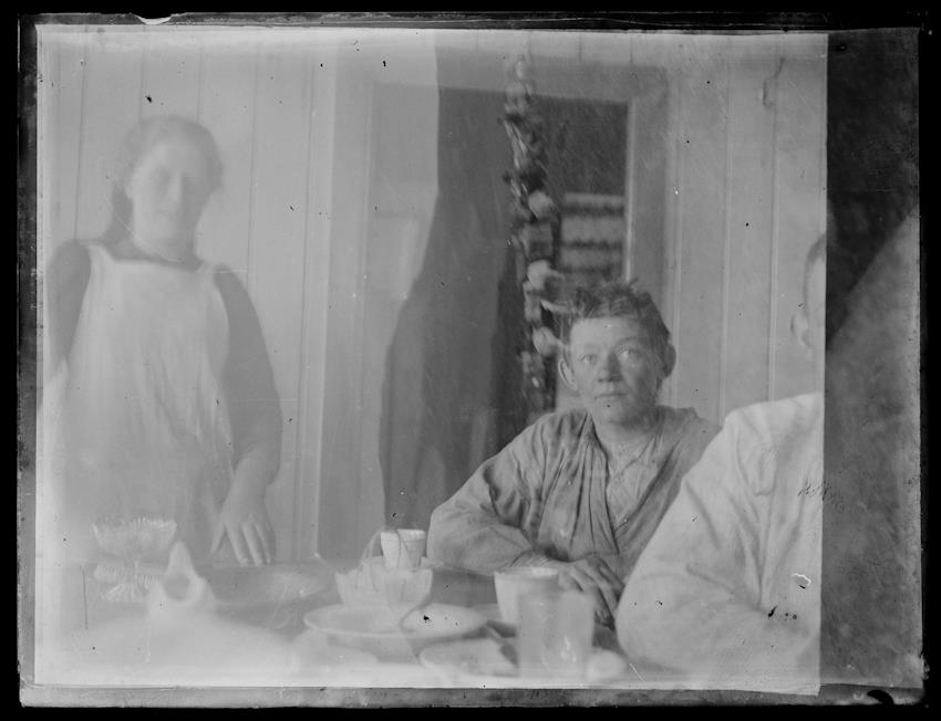 Fólk við matarborð. Kona með svuntu stendur við borð þar sem sitja tveir menn. Óhreint leirtau á borði. Tvítekið er á filmuna. Hin myndin er af hestalest en hún fellur í skuggann.