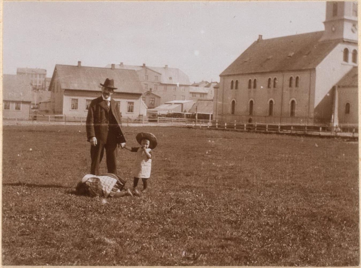 Karlmaður með hatt stendur á Austurvelli, hann heldur í lítinn dreng og hjá þeim liggur stelpa í grasinu sem er að mótmæla einhverju. Fjær sér í dómkirkjuna og fleiri hús.