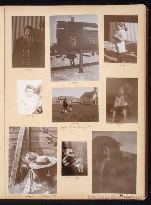 Albúm með 32 spjöldum og innlímdum 132 ljósmyndum, bæði inni- og útimyndum. Skrifaðar skýringar við myndirnar: