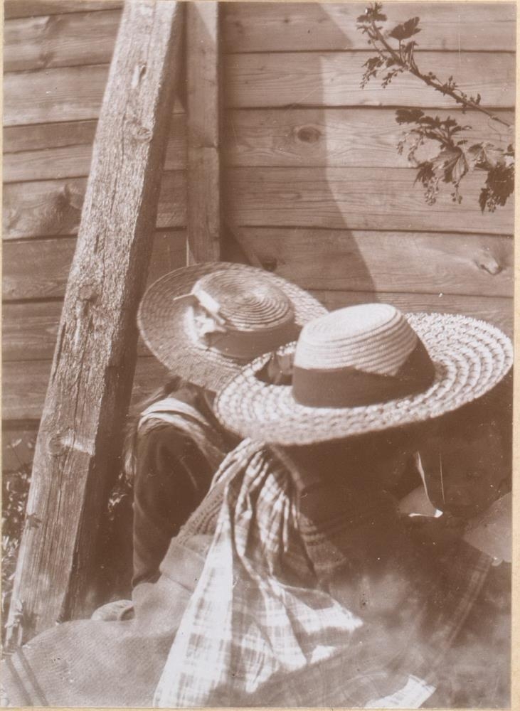 Tvær litlar stelpur og einn drengur sitja úti við timburvegg í góðu veðri, stelpurnar eru í kjólum og með hatta.