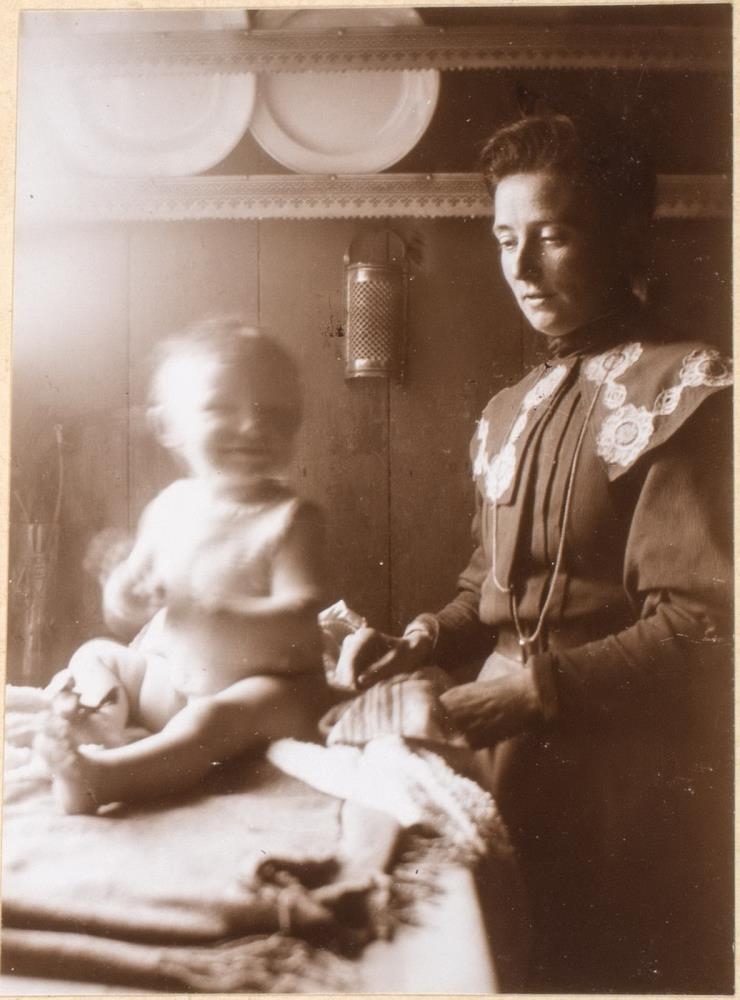 Lítil stúlka situr uppi á borði og kona stendur við borðið og er að fara að klæða barnið. Í rekka á veggnum eru steikarföt og það hangir rifjárn á veggnum.